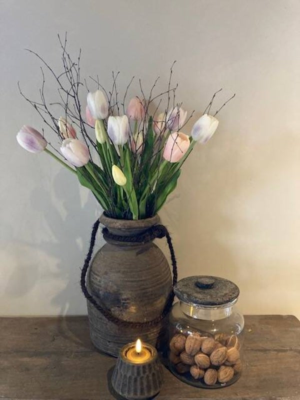In de houten kruik staan 3 bosjes en 1 bosje berkentakken