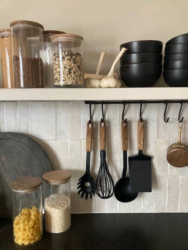 Mooi ijzeren rekje om bijv de keukendoeken, kopjes, keukengerei ed aan te hangenHet rekje is incl 6 haken De lengte is 50 cm