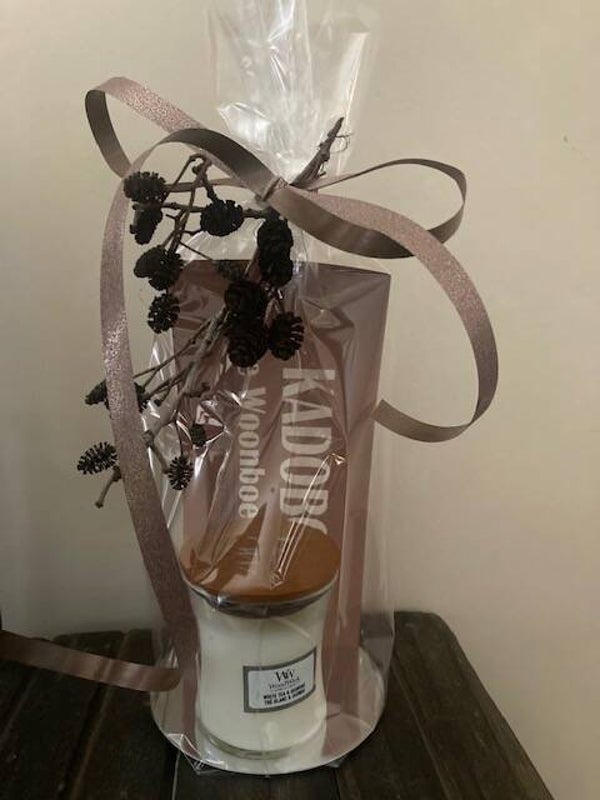 In het pakket zit een kadobon twv €45En een woodwick kaars white tea & jasmine twv €12,90We pakken het pakket leuk voor je in
