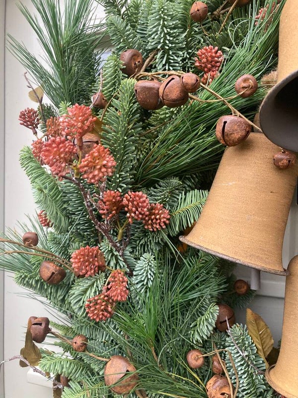 Prachtige krans van vers kerstgroen met roest belletjes en brique kleurige zijde bloemen erin verwerkt